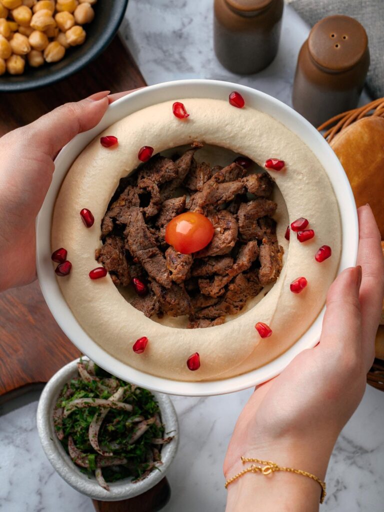 Plate of hummus with tahini topped with delicious beef shawarma slices.